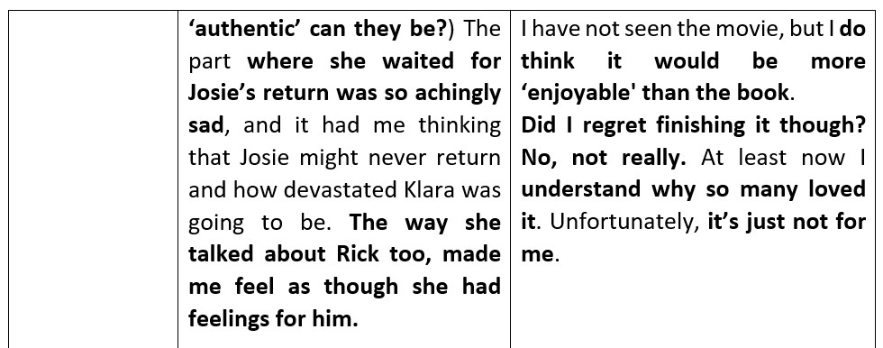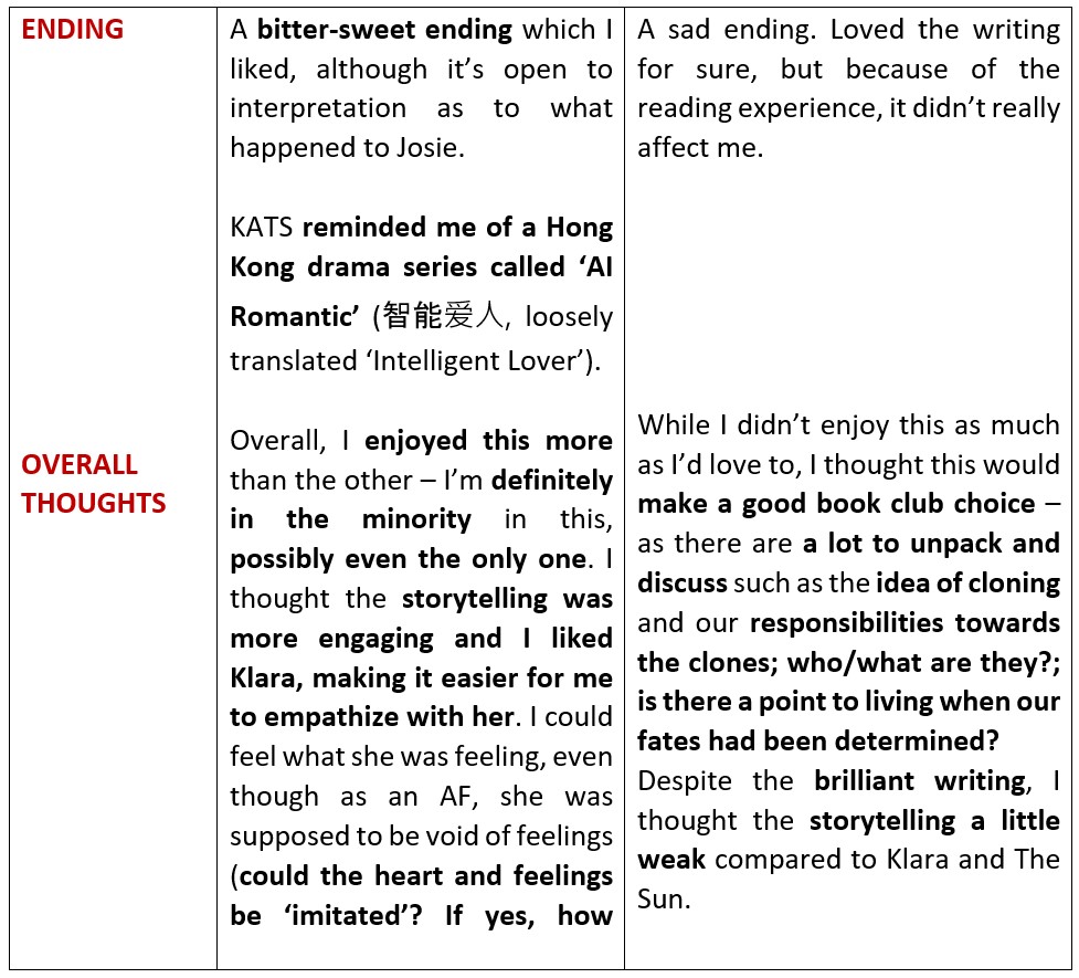Here’s my comparison of them (I’ve done it in a table format as for me, personally, I found it easier to compare it this way) and why I preferred ‘Klara and The Sun’ to ‘Never Let Me Go’: